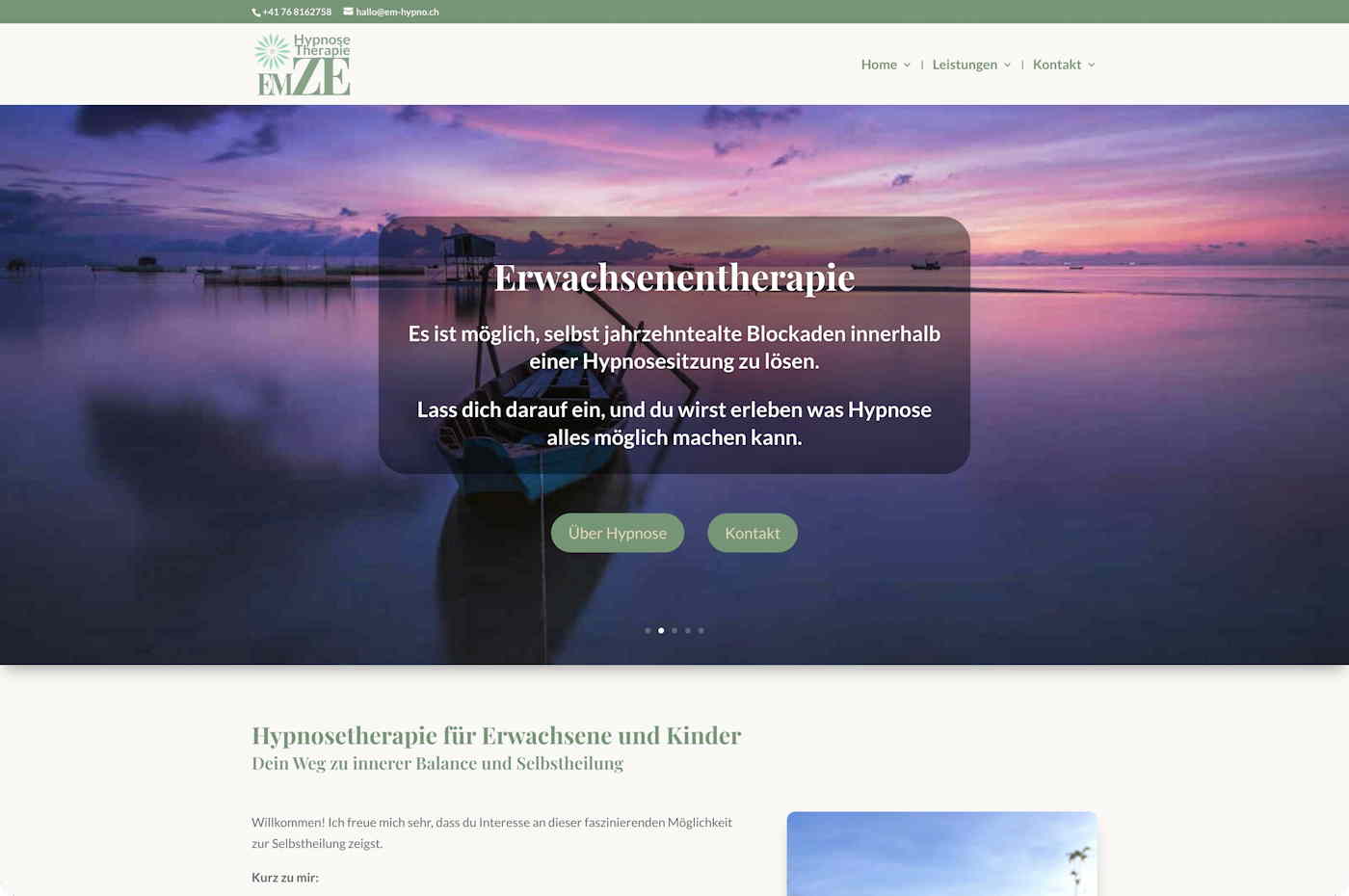 Die Website präsentiert die Hypnosetherapie der Anbie­terin. Mit einem klaren und harmonischen Design ver­mittelt sie Vertrauen und Professionalität. Besucher erhalten fundierte Informa­tionen über Hypnose, ihre Anwendungsmöglichkeiten und die therapeutischen Ansätze für Erwachsene und Kinder. Die Buchung eines Termins ist einfach und direkt möglich.